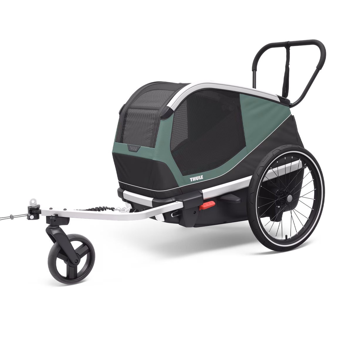 - Со отстранување на тркалата и влечната рачка, приколката безбедно стои на цврстата пластична основа, овозможувајќи ви безбедно да го дресирате вашето куче внатре;